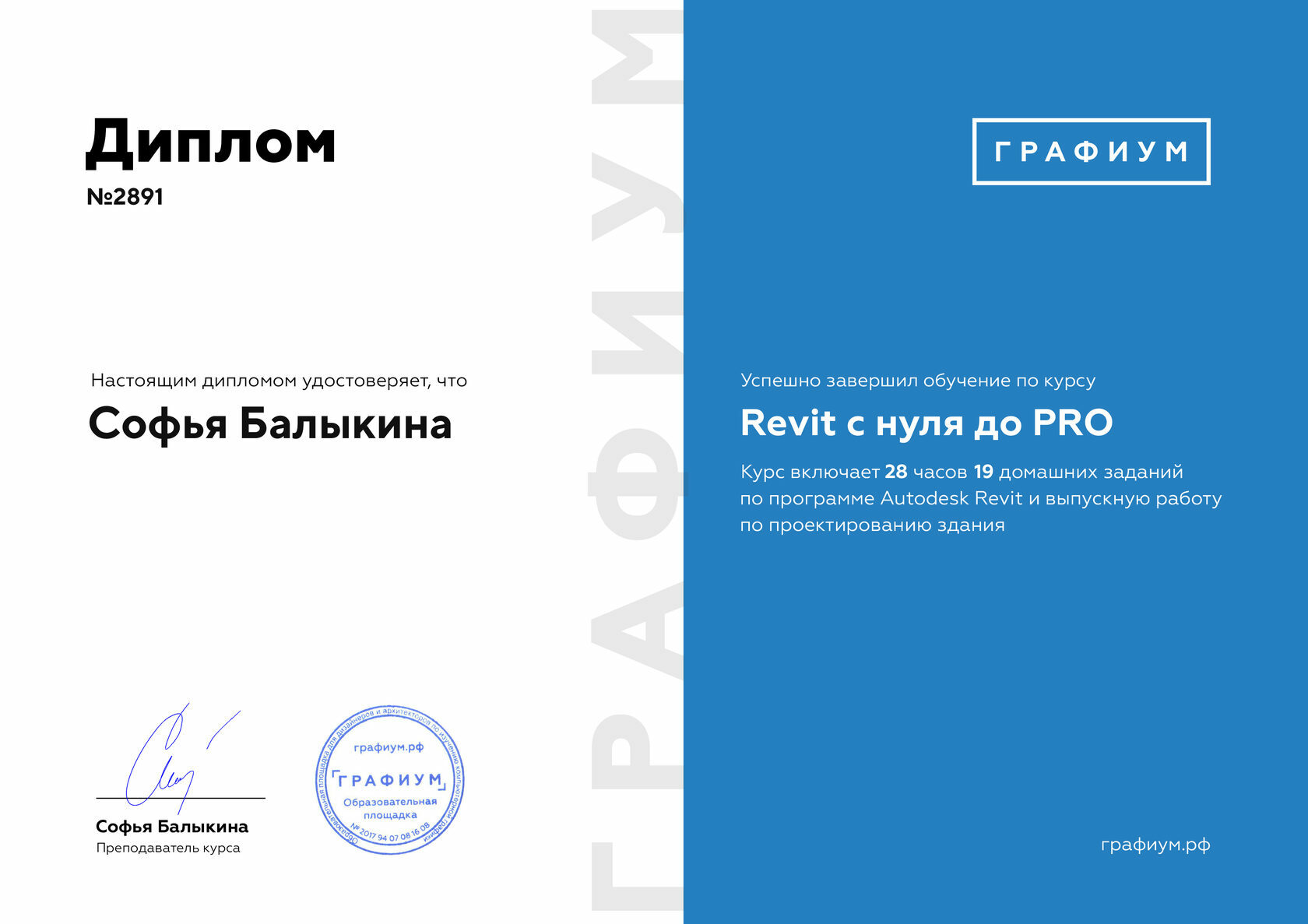 • Диплом о прохождении курса